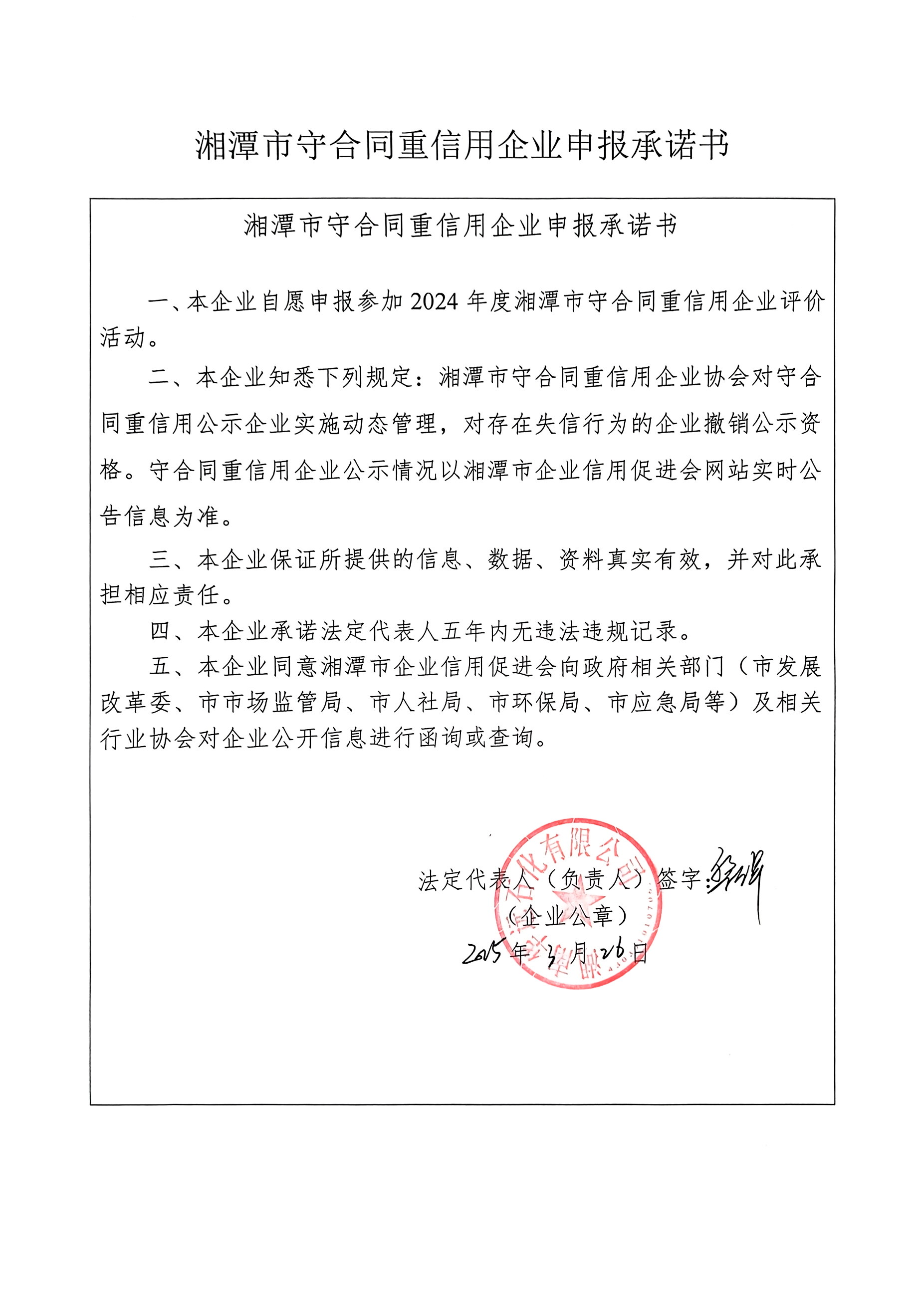 本企業(yè)根據(jù)《湘潭市守合同重信用企業(yè)申報(bào)規(guī)定》等編制 2024 年度企業(yè)信用報(bào)告書,并保證本報(bào)告書內(nèi)容真實(shí)、準(zhǔn)確、完整。