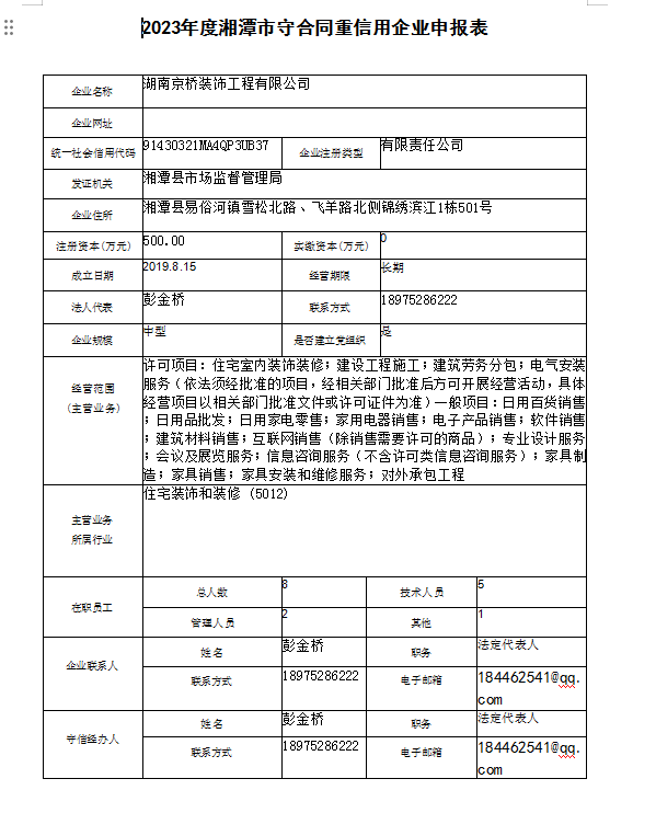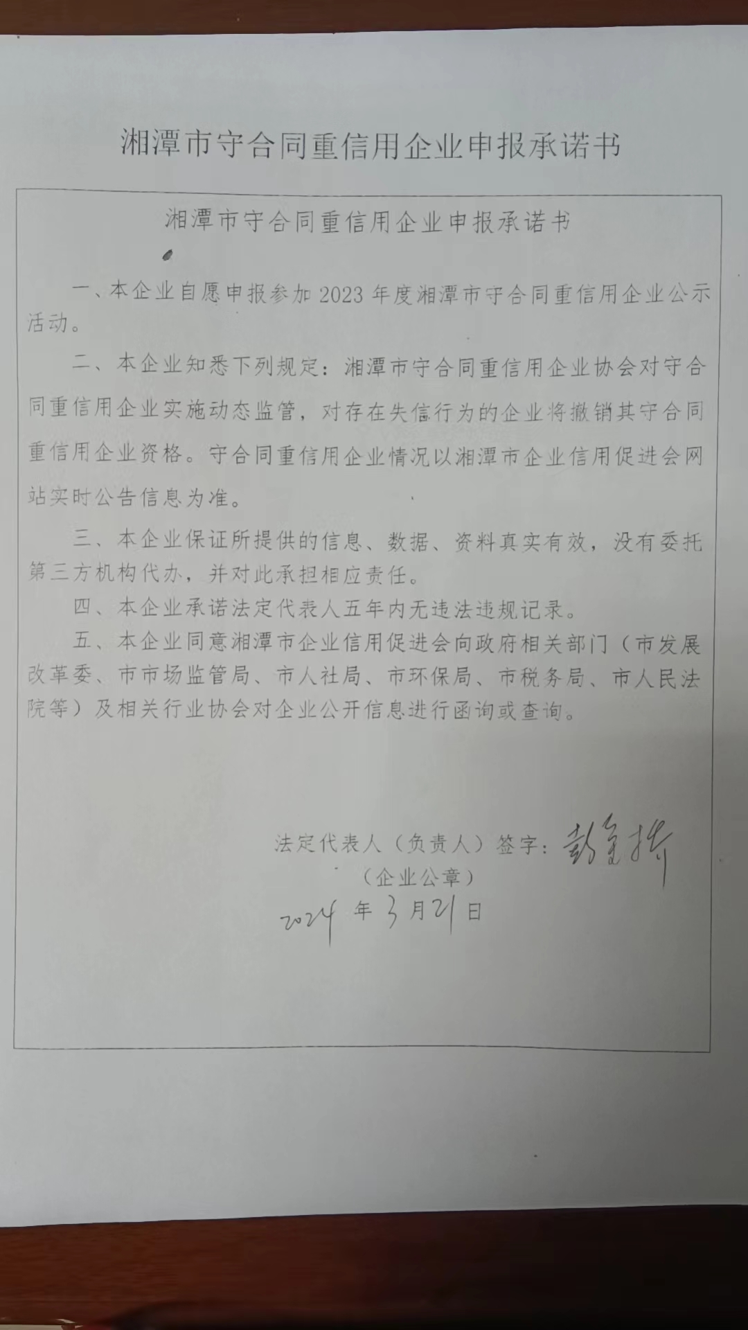 本企業(yè)根據(jù)《湘潭市守合同重信用企業(yè)申報規(guī)定》等編制 2023 年度企業(yè)信用報告書,并保證本報告書內(nèi)容真實、準確、完整。