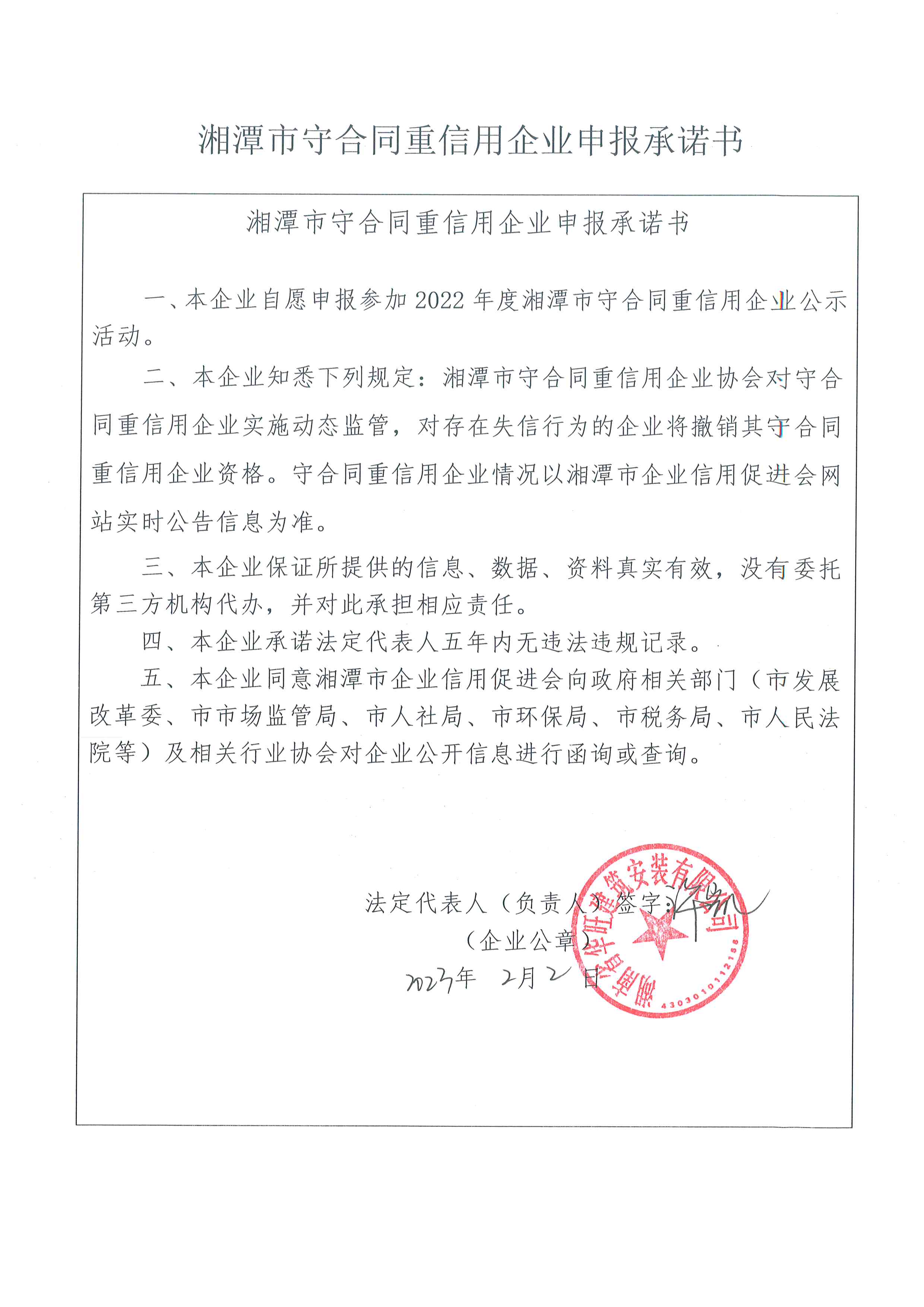 本企業(yè)根據(jù)《湘潭市守合同重信用企業(yè)申報(bào)規(guī)定》等編制 2022 年度企業(yè)信用報(bào)告書,并保證本報(bào)告書內(nèi)容真實(shí)、準(zhǔn)確、完整。