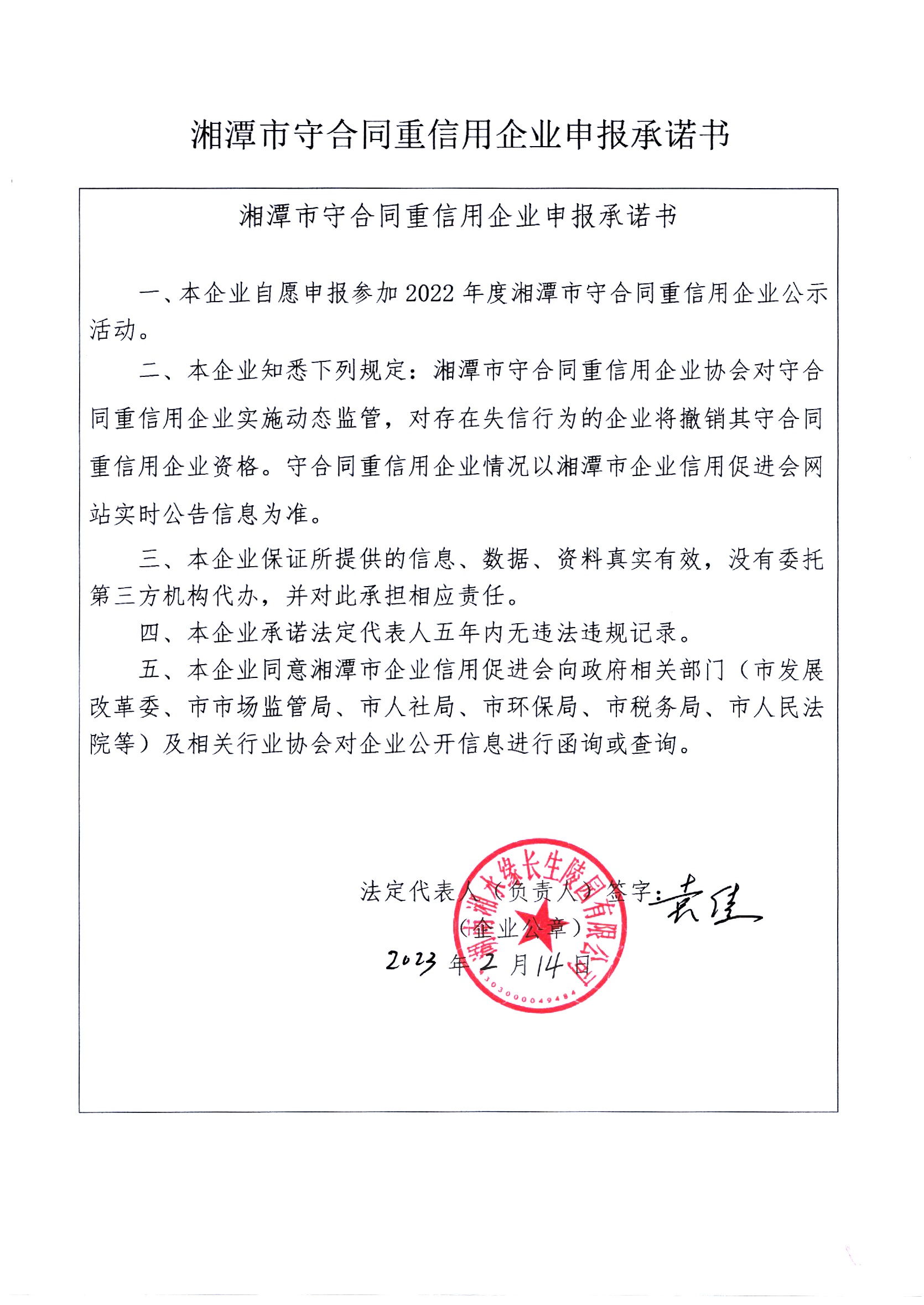 本企業(yè)根據(jù)《湘潭市守合同重信用企業(yè)申報規(guī)定》等編制 2022 年度企業(yè)信用報告書,并保證本報告書內(nèi)容真實、準(zhǔn)確、完整。