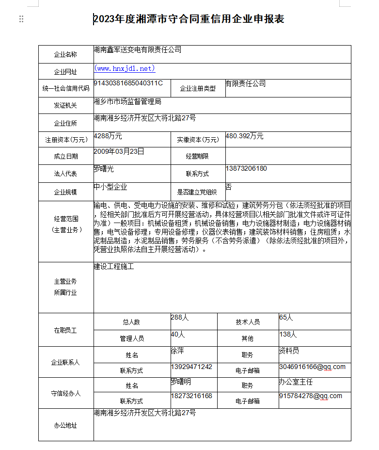 本企業(yè)根據(jù)《湘潭市守合同重信用企業(yè)申報規(guī)定》等編制 2023 年度企業(yè)信用報告書,并保證本報告書內(nèi)容真實、準確、完整。
