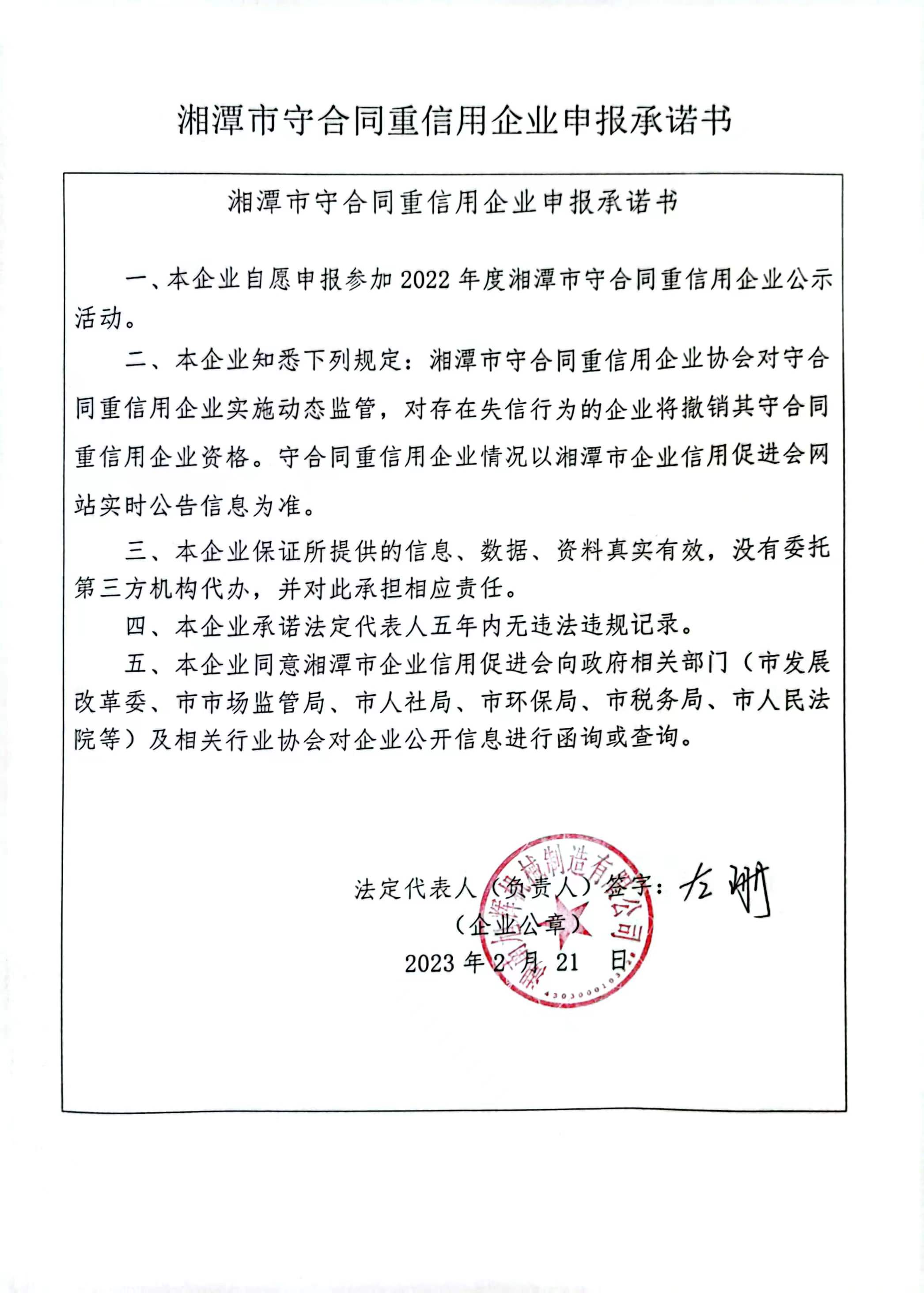 本企業(yè)根據(jù)《湘潭市守合同重信用企業(yè)申報規(guī)定》等編制 2022 年度企業(yè)信用報告書,并保證本報告書內(nèi)容真實(shí)、準(zhǔn)確、完整。