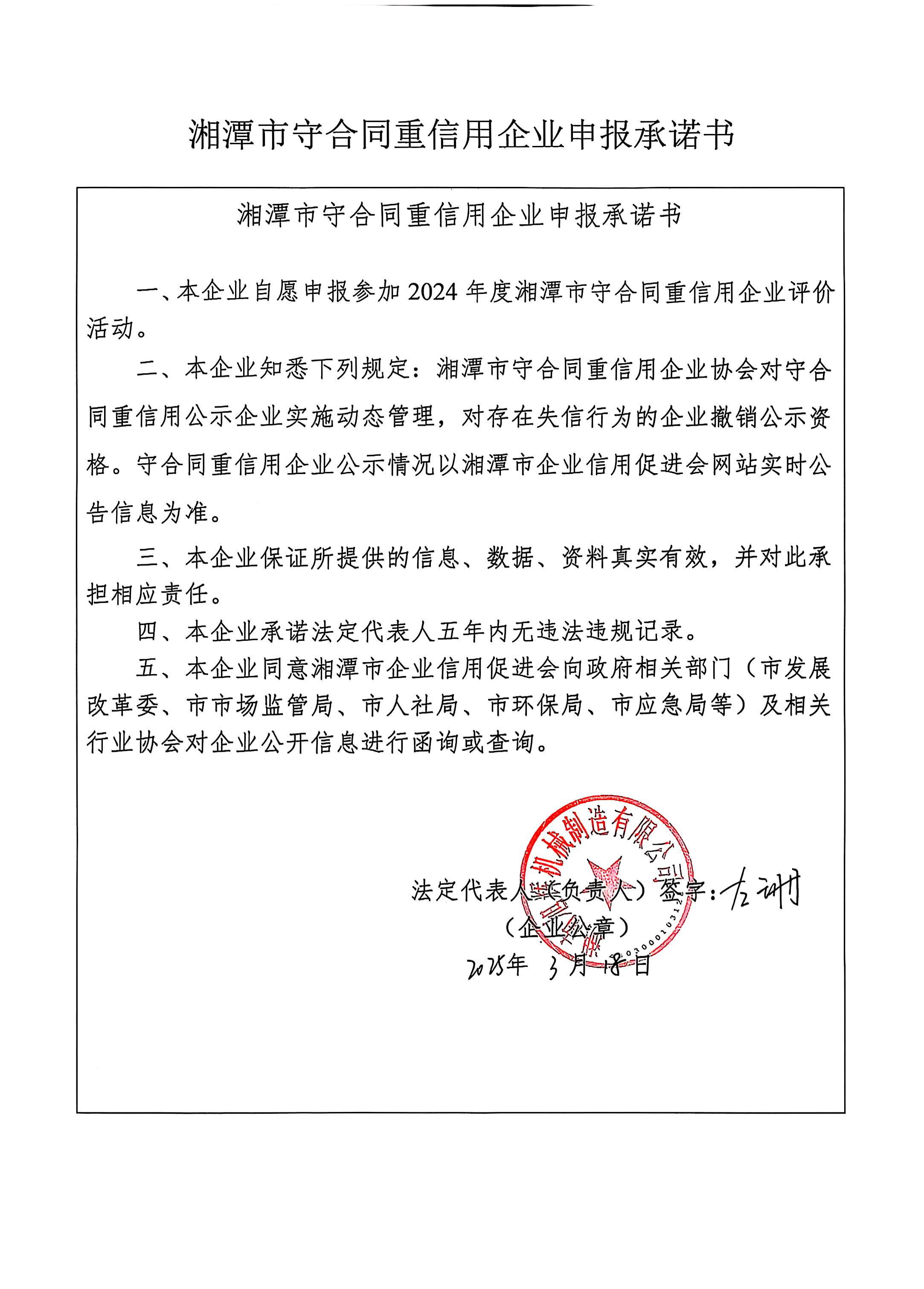本企業(yè)根據(jù)《湘潭市守合同重信用企業(yè)申報(bào)規(guī)定》等編制 2024 年度企業(yè)信用報(bào)告書(shū),并保證本報(bào)告書(shū)內(nèi)容真實(shí)、準(zhǔn)確、完整。