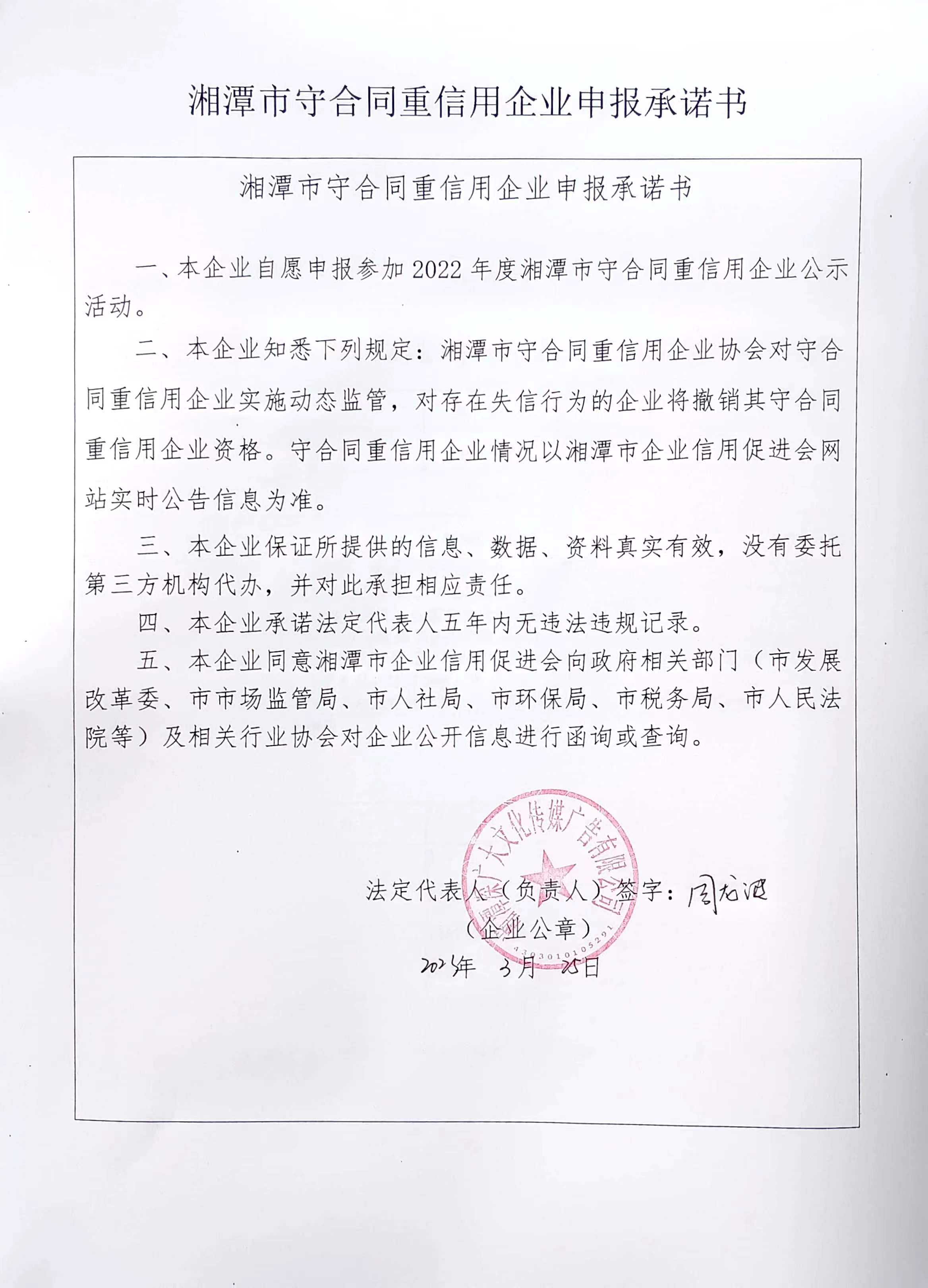 本企業(yè)根據(jù)《湘潭市守合同重信用企業(yè)申報規(guī)定》等編制 2022 年度企業(yè)信用報告書,并保證本報告書內(nèi)容真實、準確、完整。