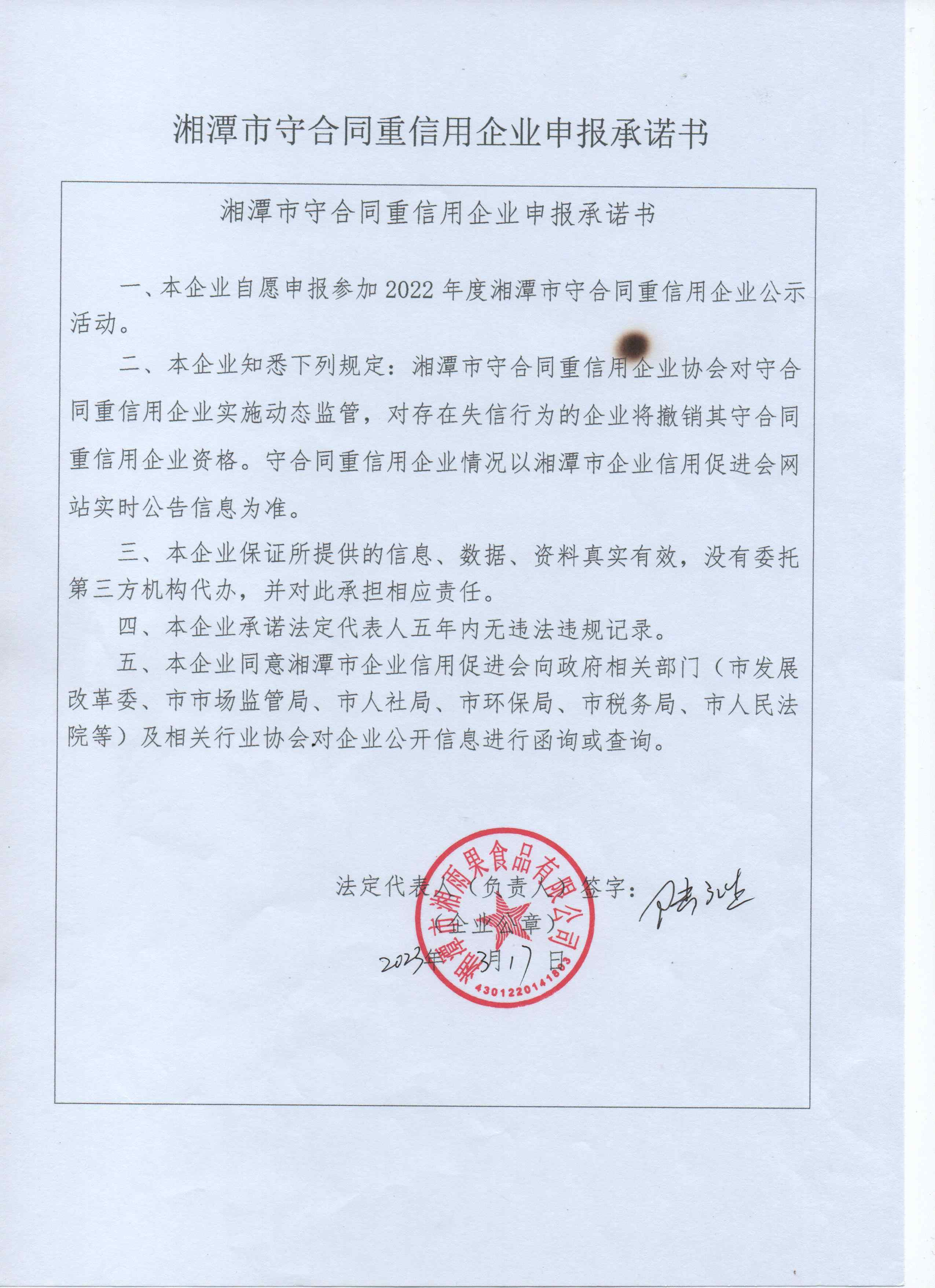 本企業(yè)根據(jù)《湘潭市守合同重信用企業(yè)申報規(guī)定》等編制 2022 年度企業(yè)信用報告書,并保證本報告書內(nèi)容真實、準確、完整。