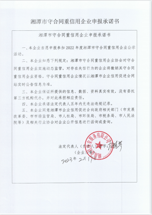 本企業(yè)根據(jù)《湘潭市守合同重信用企業(yè)申報規(guī)定》等編制 2022 年度企業(yè)信用報告書,并保證本報告書內(nèi)容真實、準確、完整。